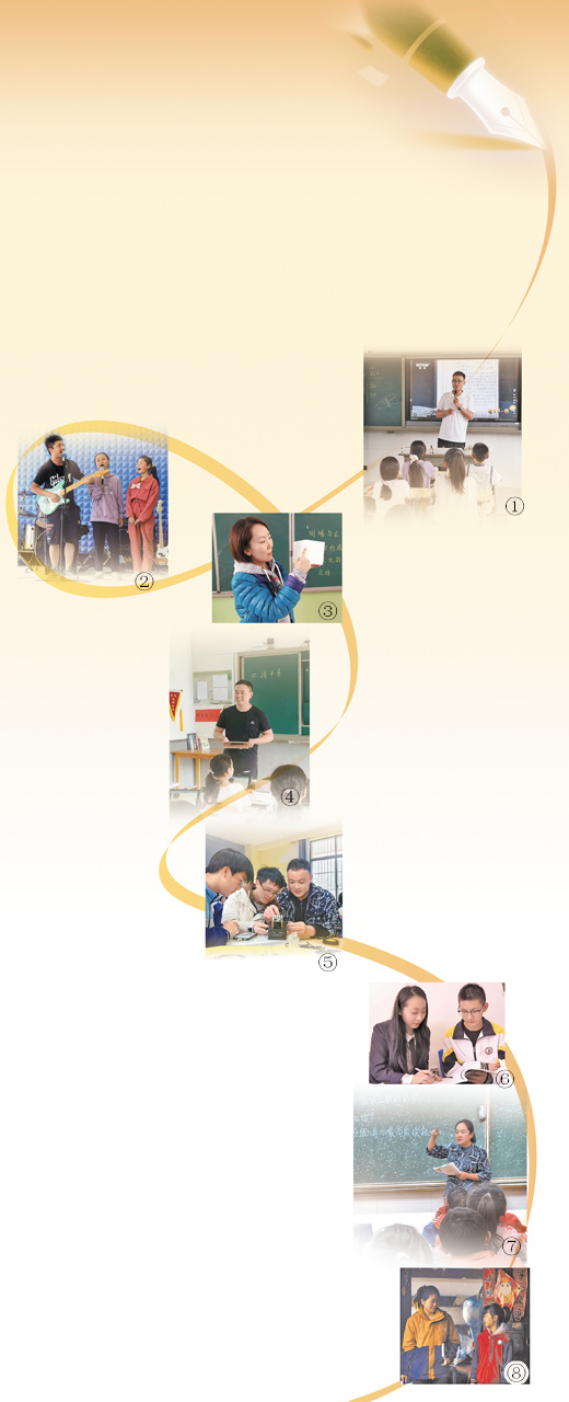 在教师节的第41天之际,秘书长Xi Jinping对国家特别邮政教师代表写了回应,强调,自“特殊邮政计划”实施以来的过去20年中,大多数特殊邮政教师一直积极专注于自己的农村教育事业,将其置于podium上,重点放在了自己的教育上,并专注于自己。 - 贡献,显示老师的感受和责任。一块粉笔,三英尺的讲台。有一群人遵守最初的教育意图,继续提高他们的教学和教学技巧,关心和爱心,以指导孩子成长健康,并为在农村建立乡村变革和发展教育能力做出贡献。最近,我们的记者与该国特别老师的8位代表接触了他们在农村的乡村故事,并努力工作,并感到他们的毅力和努力rgy。 ---亨南省芬奇县潘迪安小镇达克森小镇的老师伦·明吉(Ren Mingjie),最初的意图标志着报纸记者的日记Huang Chao Ren Mingjie的日记,这是1990年代出生的一位乡村老师(请参阅1990年代的教育学教学(见Picture①河南县的镇,只有一名特别的邮政老师。爱上这份工作。准时的OMEWORS,但他并没有责怪他。取而代之的是,他们当天早些时候坐在教室的门口,独自纠正他们的作业。在这种坚韧中,她指导孩子们养成巨大的学习习惯。随着时间的流逝,他更擅长处理教学,班级管理和其他活动:参加基本班级技能竞赛,从KCITY资产到省级竞争,然后再参加国家竞争;参加河南省受欢迎的班教师工作室的工作,并通过微信公共帐户推动了培训结果。在他和他的同事的努力中,面对整合的教学点是在完整的基础学校的一所完整学校中形成的,以及从最初的80人增加到140多个学生的数量。今天,Ren Mingjie将他的一些教学日记放在了受欢迎的班级教师官方班级的官方课堂上。在其中浏览图片和文本之间这条线是他符合道路教育的最初意图的证人,也是农村教育发展的标志。 Gu Ya是吉州省Liupanshuicity的Dawan镇Haiga小学的一名老师,使用音乐来减轻儿童梦想。该报纸的记者吴丹很快,吉州省利帕申市达万镇的Haiga小学,已经发起了音乐的邀请 - “ Haiga Boys”音乐会“音乐会”。在演唱会的3个半小时之内,孩子们表演了一个令人惊叹的邀请和奇怪的人,曾在山上表演了山脉,请访问山脉。他在2016年初到达Haiga小学时,他清楚地记得:从学前班到三年级的学生,他转过身来教书。他们自己的举措,”瓜雅说。吉(Gui)成立了乐队,有时有一个“摇滚梦”。有一天,瓜ya,在宿舍里弹吉他,突然发现许多孩子在窗台上躺在窗台上,看着他躺在他的好奇心和欲望中 - 充满好奇心和欲望。坐在操场上,开发乐队的想法来自2017年的孩子们的愉快的面孔。当他们第一次站在舞台上后,他们第一次加入乐队的美女,不仅是注意,也是信心和欲望。前往海南(Hainan)的旺旺(Wenchang),目睹火箭落入天空,并在在线春季节晚会的舞台上发光。 “ Haiga Boy”骑在音乐的翅膀上,走出山上并探索外界。尚奇省林县的Baijiaban登机小学老师Wang Xiangru建立了各种颜色的学校。记者也是本报纸的记者。 A rural school, a classroom of art, and a background wall with a sea theme is remarkable: Dolphins made of foam glue and clown fish are playing lively ... This is Wang Xiangru, a Baijiaban Boarding Primary School teacher in Liujiahui Town, Lin County, Shanxi ProvinceG Photo ③, picture provided by the interviewer), an interviewer picture, carefully created for children. “当墙壁上有色时,儿童的生活是彩色的。” Wang Xiangru说:“我想建立一所各种颜色的学校,并使用艺术来带他们看一个更大的世界。”毕业后ROM大学在2012年,Wang Xiangru回到了他的家乡,并成为了一名特别的邮政老师。 “在我到达林县Tuanshuitou Town的Huangjiagou教学网站后,我得知我确实是学校艺术的第一位老师。如何教书?”他开始思考。在校园外,奇怪的洞穴,活泼的旧树木和斑驳的拱形桥吸引了Wang Xiangru的注意。他说:“乡村没有任何条件,但没有景色。自然是教室,小刷子绘制了生动的作品。我知道这些简单的大纲是孩子想用刷子表达的世界。去Baijiab后Wang Xiangru是寄宿小学,除了教学和教学教学和教学教学手工艺教学和教学教学和教学外,还继续遵循这种哲学教学。 “安河省霍克县的小休尔已经成为村民家面前的一所好学。记者也是这本报纸的记者。她每天早晨,她站在学校的大门来迎接学生,与他们的学校开心,看着他们的学校;晚上,他在晚上,他看着孩子们最近的餐厅,他们的父母是他们的最新介绍...省Zhang Huajian的一天 - 至今的生活,中央小学和特别邮政老师的校长(见图片④记住他的心。谈论乡村突袭的经历15年,张·霍吉安说:“最困难的回报是我在砖头B的主要学校时小镇上的Uddha寺。 “张华太知道每个孩子都是家庭的未来,应该正确地经营学校。在一个更清晰,更广阔的世界中,大型农村学校的儿子反复地看着电影,学生们强烈盯着屏幕,跟随电影的轮廓,有时是紧张,有时甚至很有趣。当我去省首都赫菲(Hefei)参加“中国太空日”活动时,孩子们走进了实验室,科学骨头安静而发芽。当我参加“时间剪影”活动时,孩子们用镜头来获得热时刻并编织了热门的回忆...”我继续坚持不懈Al教育讲台,并在村民的房屋前建立了一所美丽的学校。我希望成为带领孩子们发现世界的财富和全球伟大的窗户和桥梁。”张华江为未来充满活力。HuangChunli是Hubei县的Fengxi Town Central School的老师Huang Chunli,在Hubei County,Hubei Province,建立了一个桥梁,在家庭和学校之间建立了一座桥梁。 Qinba山脉和井,Chongqing和Shaanxi大约需要3个小时才能